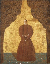 | 【1946年 (昭和21年)】 9月23日、有元吉民・琴子の四男として一家の疎開先である岡山県津山市小田中に生まれる。家族は祖母・み子、父母、長兄・真一、次兄・靖男、三兄・信夫。 【1947年 (昭和22年)】 生後3ヶ月余りの1月、祖母と母、そして3人の兄とともに上京。 【1953年 (昭和28年)】 4月、台東区立谷中小学校に入学。 在校中、油彩を始め、絵画コンクールに出品した「友人(木版画)】」が、最優秀賞に選ばれ知事賞を受ける。 【1959年 (昭和34年)】 4月、台東区立上野中学に入学。 【1962年 (昭和37年)】 4月、私立駒込高等学校に進学。 当時東京藝術大学の大学院生だった版画家の中林忠良が、美術の時間講師として教鞭を取る。中林との出会いにより、絵の道を志す。 【1965年 (昭和40年)】 3月、私立駒込高等学校を卒業。 【1969年 (昭和44年)】 4月、東京藝術大学美術学部デザイン科に入学。 芸大在学中、日本画科、彫刻科、版画研究室、さらには音楽学部にまで足を伸ばし、広く多方面にわたって吸収する。 後の夫人・渡辺容子と出会う。 【1971年 (昭和46年)】 3月、初めての海外旅行でヨーロッパへ。 最初に足を踏み入れた地で、フレスコ画・カタコンベの壁画に対面。また、フィレンツェでフレスコ画と日本の仏画に共通点を見出し、日本に帰ったら岩絵具をやってみようと決意。 一方、デザイン科全員で古美術研究旅行をし、京都・奈良に残る多くの古美術を鑑賞。 【1972年 (昭和47年)】 丸山寿嗣、箕浦昇一、北村治、三井卓大、有元利夫の5人共同で朝日広告賞および毎日広告賞に応募し、毎日広告賞で佳作に入選。 ヨーロッパの古典絵画や日本の仏画に強い興味を持っていたことから卒業制作で「私にとってのピエロ・デラ・フランチェスカ」という題で、10点連作の作品を作る。 10月23日、電通に就職が決まったのを機に、東京藝術大学日本画科を卒業していた渡辺容子と結婚。 【1972年 (昭和47年)】 丸山寿嗣、箕浦昇一、北村治、三井卓大、有元利夫の5人共同で朝日広告賞および毎日広告賞に応募し、毎日広告賞で佳作に入選。 ヨーロッパの古典絵画や日本の仏画に強い興味を持っていたことから卒業制作で「私にとってのピエロ・デラ・フランチェスカ」という題で、10点連作の作品を作る。 10月23日、電通に就職が決まったのを機に、東京藝術大学日本画科を卒業していた渡辺容子と結婚。 【1973年 (昭和48年)】 3月、同大学卒業。卒業制作は大学買上げとなる。 月、電通に入社。 7月、葉工房1回展(箕浦昇一と二人展)】をギャルリー・ド・ジョワイユで開催。 【1974年 (昭和49年)】 6月、箕浦昇一と本格的な二人展をみゆき画廊で開く。 「曙光」「運動する人」などを出品。 1975年 (昭和50年)】 谷中の実家近くに自分のアトリエを持つ。 6月、初めての個展をみゆき画廊にて開催。 「こもりく」「重奏」「手品師」「麗色」「夜の居間」など18点出品。 この後、毎年のようにみゆき画廊をはじめ、大阪や名古屋等で個展やグループ展を開催。 【1976年 (昭和51年)】 3月31日、電通を退社。 4月、母校の東京藝術大学で非常勤講師になる。 【1978年 (昭和53年)】 4月、「花降る日」が第21回安井賞特別賞を受賞。 【1979年 (昭和54年)】 5月、第3回具象現代展に「部屋の遊戯」「ある経験」の2点出品、優秀賞を受賞。 【1981年 (昭和56年)】 2月、第24回安井賞展で「室内楽」が安井賞を受賞。 【1983年 (昭和58年)】 5月、第2回美術文化振興協会賞を受賞。 【10月19日、長男・利彦が生まれる。 【1984年 (昭和59年)】 2月、第1回日本青年画家展が日本橋三越で開かれ「7つの音」が優秀賞を受賞。 11月3日、入院。 【1985年 (昭和60年)】 2月24日、肝臓癌で逝去。38歳。 |